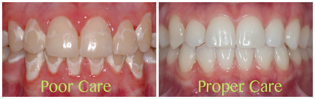 If during treatment we notice that a patient is not using proper oral care and white spots are starting to form, there are a few things in our office that we can do to help. We will offer additional training and counseling with both patients and parents on proper brushing techniques, or if we continue to see no improvement, we will remove the orthodontic wires completely and advise a routine of brushing three times a day and/or additional dental cleanings as necessary to prevent the white spots from growing. Lastly, a new technique called Icon resin infiltration will stop the progression of white spots and even improve the white spots to a certain degree.